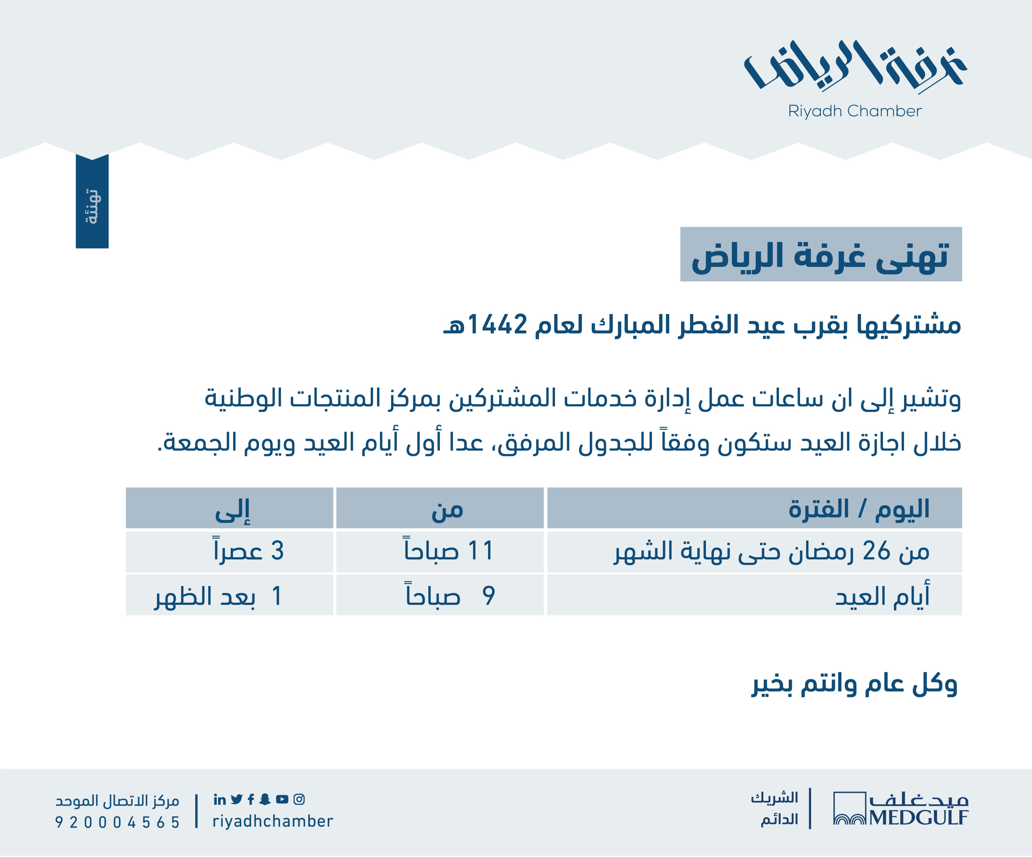 غرفة الرياض on twitter تهنئ غرفة الرياض مشتركيها بقرب حلول عيد الفطر المبارك لعام 1442هـ وتشير إلى أن ساعات عمل إدارة خدمات المشتركين بـ مركز المنتجات الوطنية خلال أجازة العيد ستكون كما هو موضح بالجدول